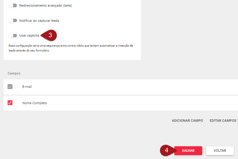 Nº3– Já dentro da edição, role para baixo até localizar a opção de Usar Captcha e a ative.