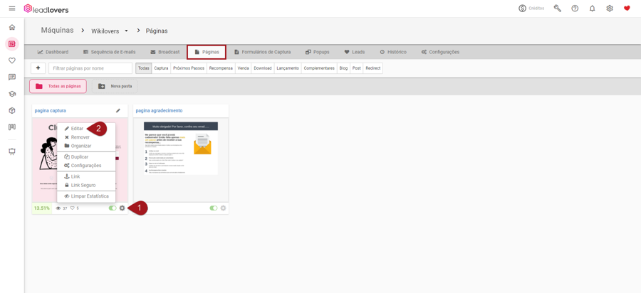 Nº1– Dentro da aba “Páginas” da sua máquina, localize a sua página de captura e clique no ícone de engrenagem no seu canto inferior direito.