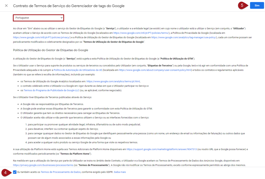 Antes de terminar a criação da sua conta, será necessário aceitar o Contrato de Termos de Serviço do Gerenciador de tags do Google. Por padrão ele estará em inglês, mas logo no início da página é possível alterar o idioma.