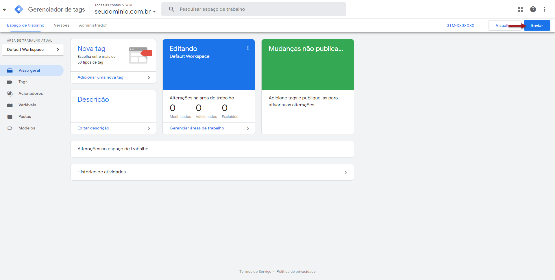 Depois que fechar o pop-up e configurar os scripts, essa será a visão do seu gerenciador. É neste espaço de trabalho que você poderá criar novas tags, acionadores e variáveis de acordo com a sua estratégia. Sempre que configurar uma nova tag, certifique-se de clicar em “Enviar” para que a mesma seja corretamente aplicada à sua página.