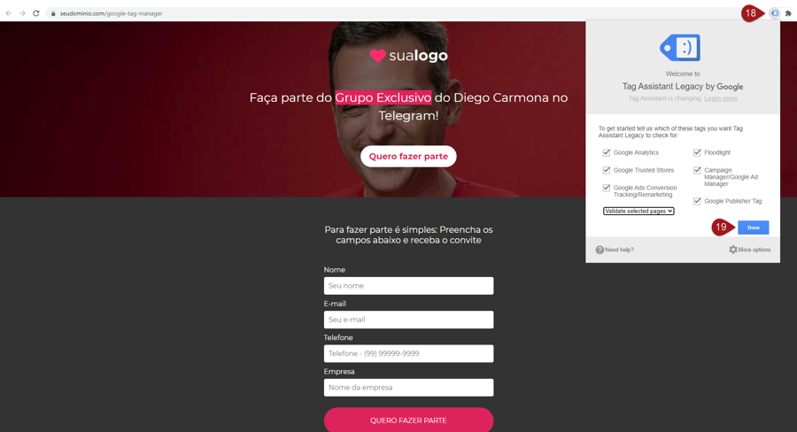 Há duas formas de verificar se as tags foram inseridas corretamente e estão funcionando na página. Uma delas é pela extensão Tag Assistant Legacy (by Google) e outra é por um site especifico para isso que o Google está desenvolvendo. Ensinaremos como verificar a instalação delas das duas maneiras.