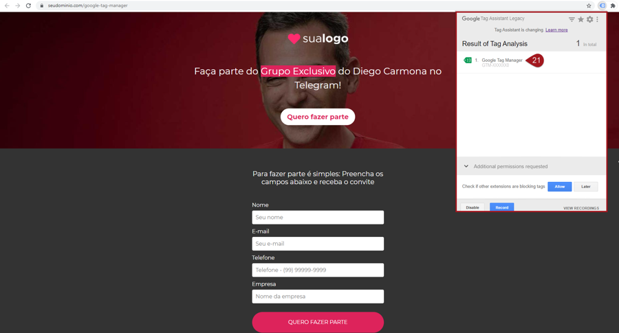 Nº18– Acesse a página que deseja verificar se as tags estão funcionando e então clique sobre a extensão.