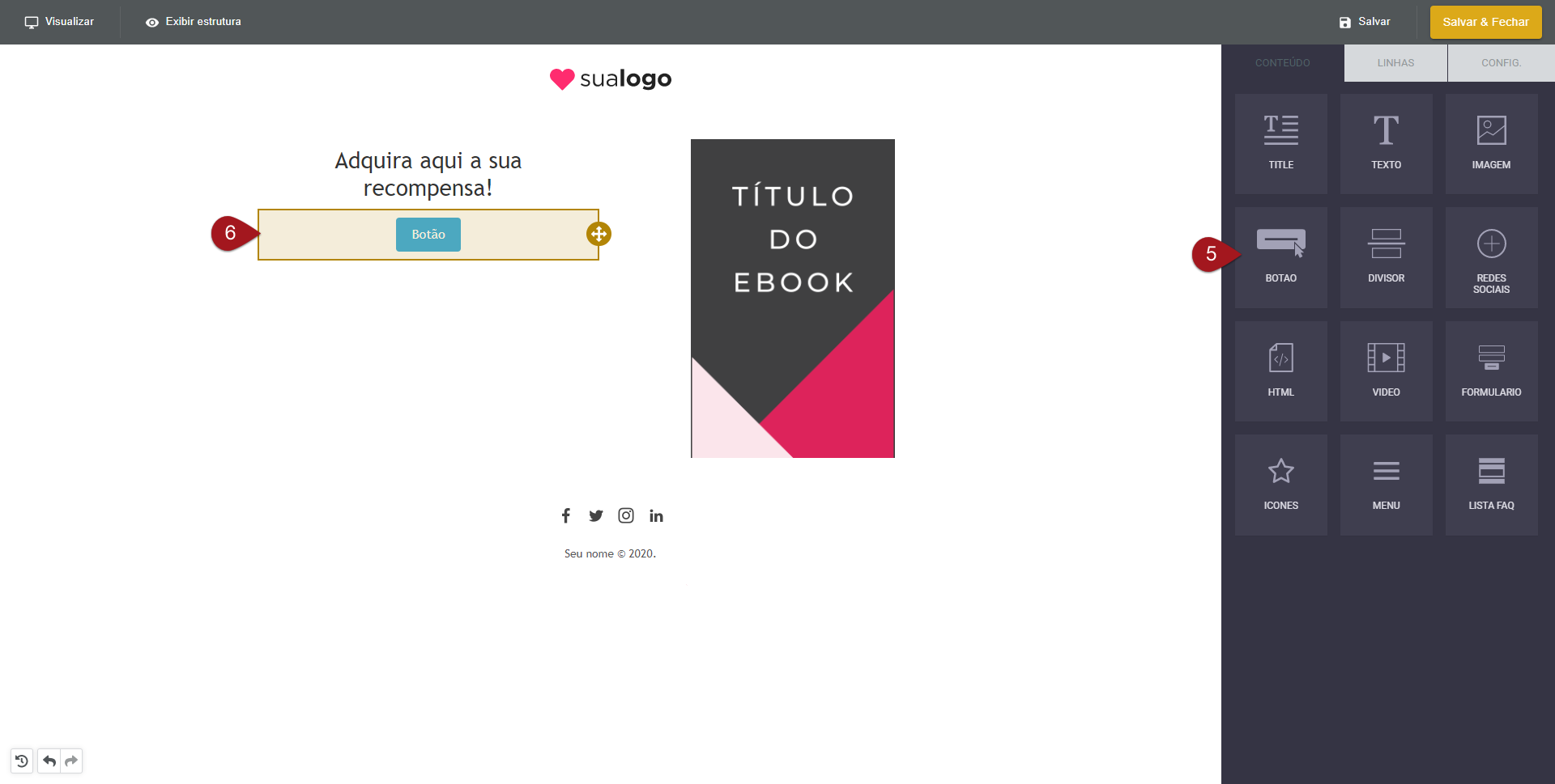 Nº5– Pressione a opção “Botão”, arraste e solte no corpo da página onde deseja inserir a recompensa.