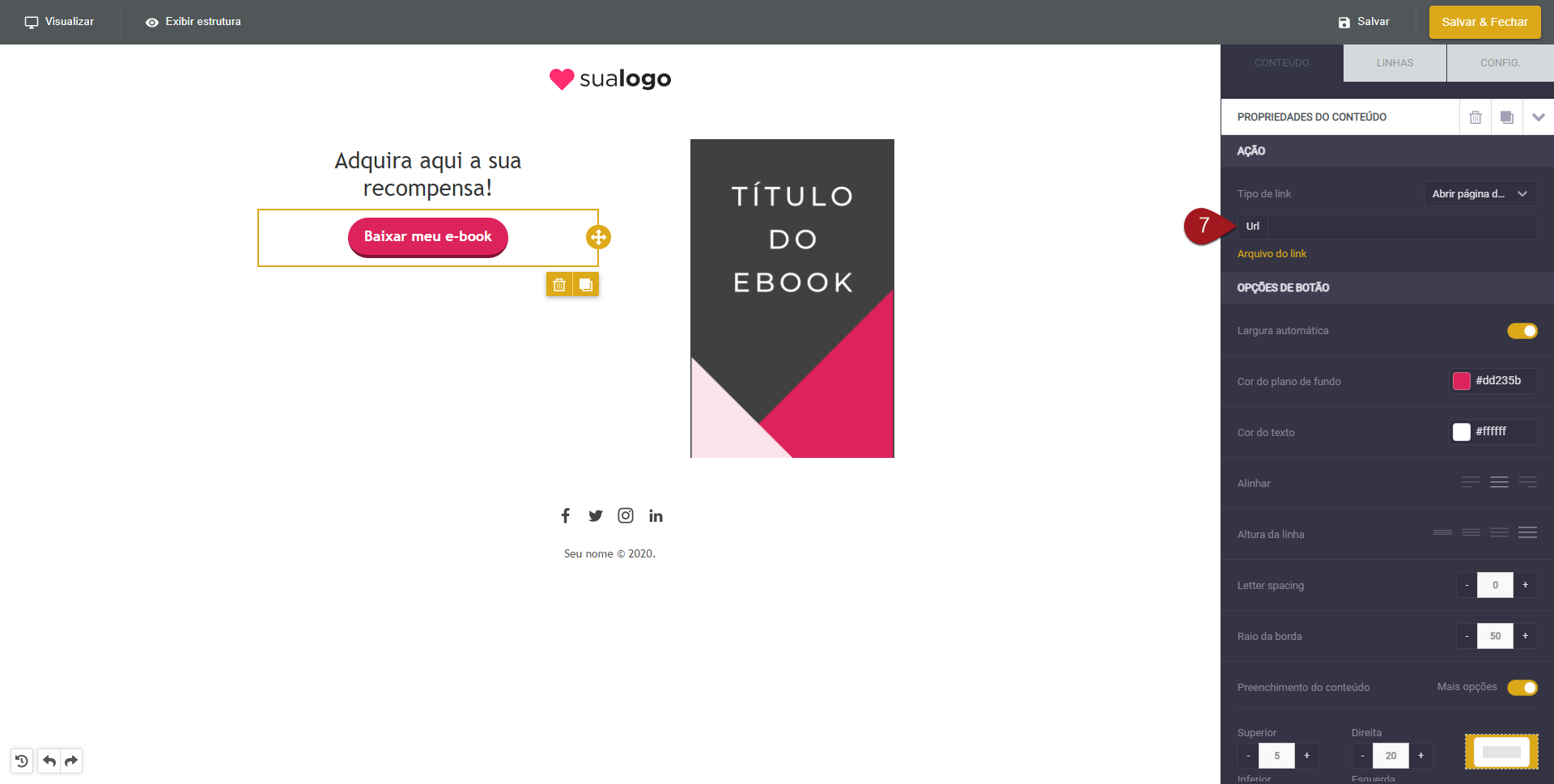 Nº7– Em “Ação”, na parte de “Url” configure o link que deseja que abra ao clicar no botão. Deixe o “Tipo de Link” como “Abrir página da Web”. Lembre-se de salvar as alterações no botão que fica no canto superior direito da tela depois que finalizar a página.