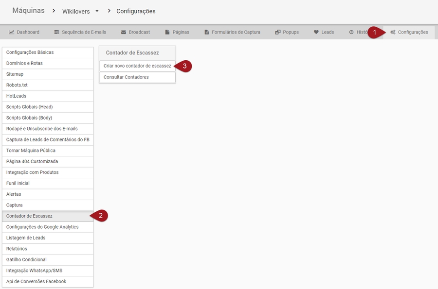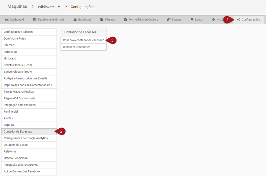 Nº2– No menu da lateral esquerda, clique em “Contador de Escassez”.