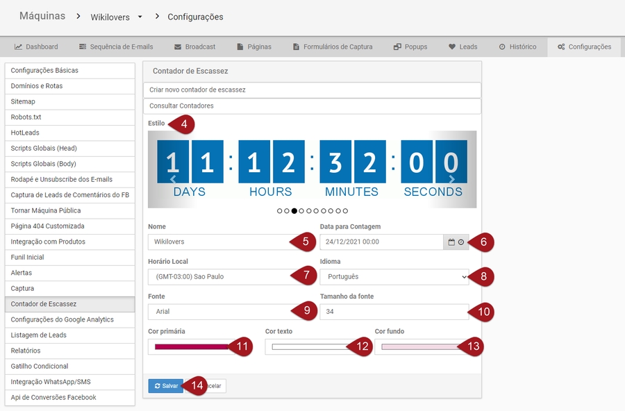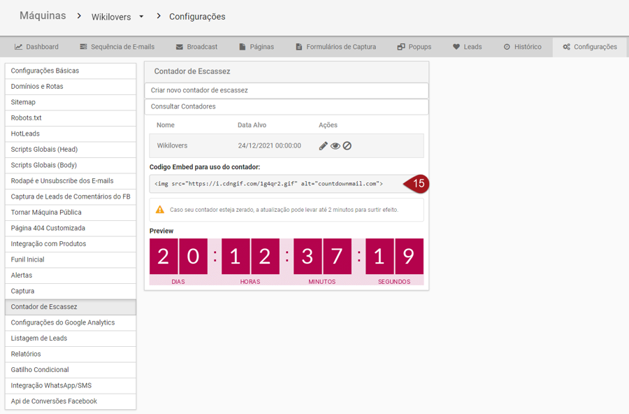Objetivo: Ensinar o passo a passo de como criar um Contador de Escassez nas máquinas da leadlovers. Para que serve: Ao criar um Contador de Escassez, é possível inseri-lo em uma página ou e-mail para ativar o gatilho mental da escassez nos seus contatos, o que pode gerar mais vendas e engajamento. Requisito Obrigatório: Ter uma máquina de e-mail criada.