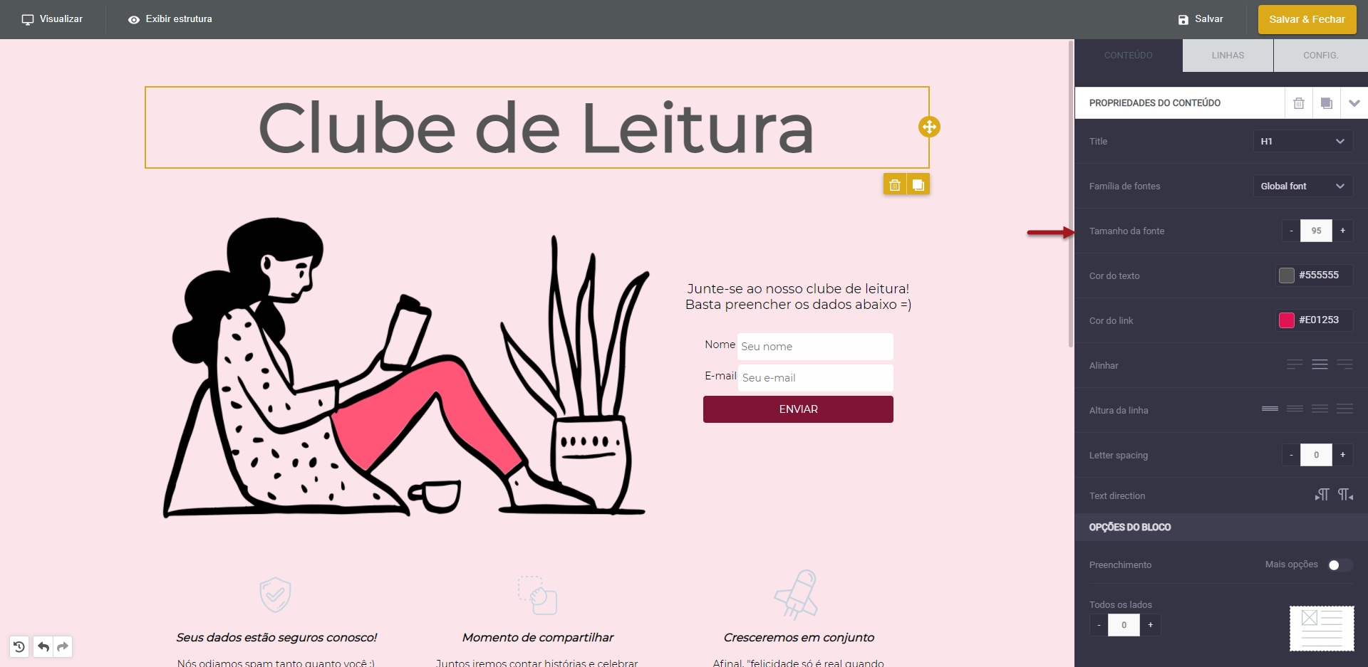 No exemplo abaixo, o tamanho da fonte do título é de 95px.