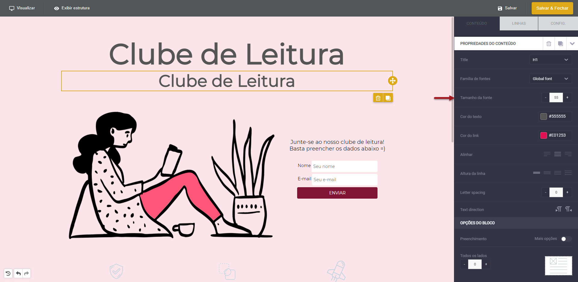 Para solucionar esta questão, nós duplicamos dentro do editor o mesmo título e o deixamos com uma fonte menor de 55px.