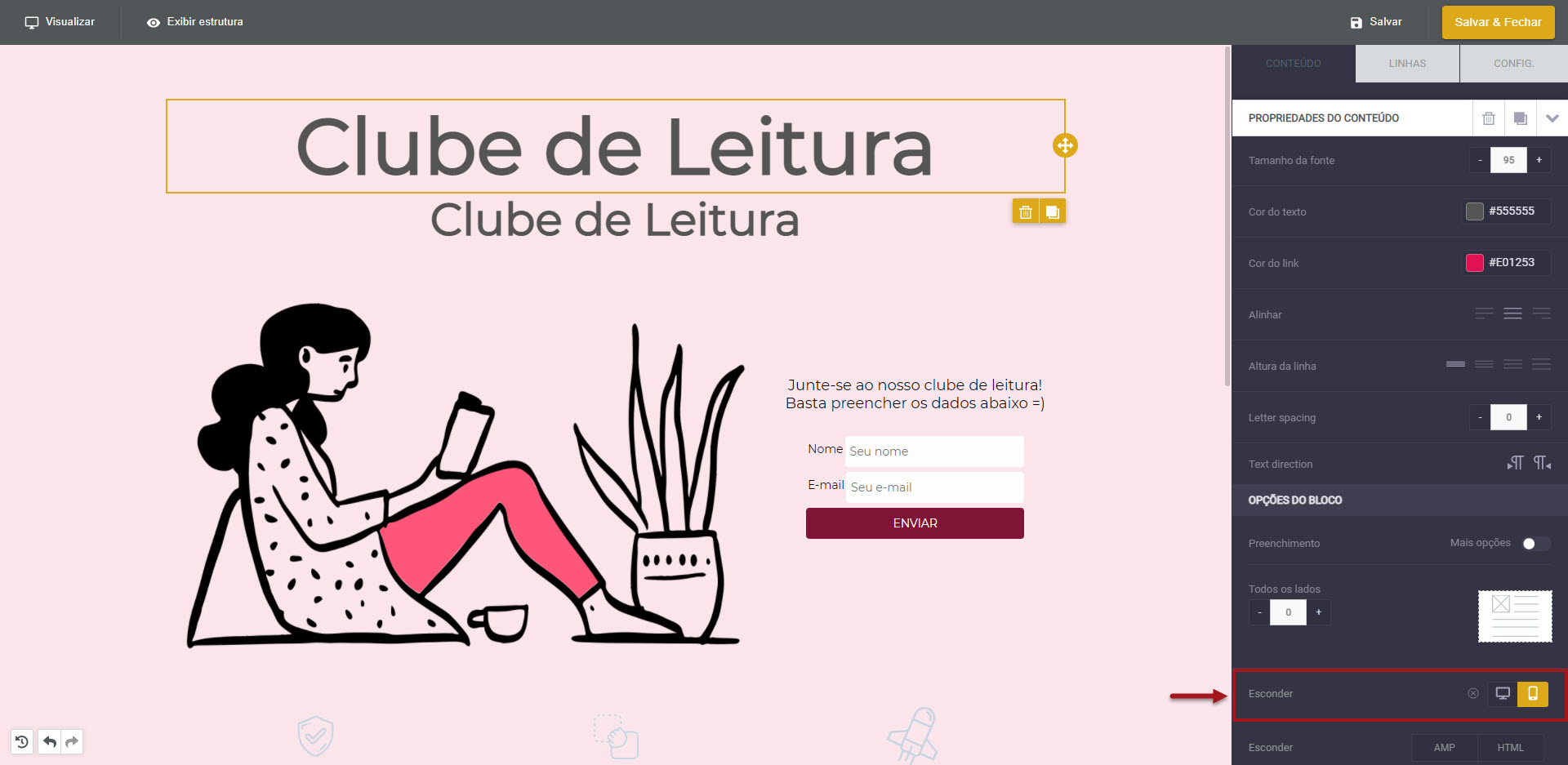 Dentro do editor os dois títulos permaneceram visíveis, no entanto, com a opção de esconder em diferentes dispositivos, foi possível ajustar a página de modo que ela se encaixasse em diferentes dimensões.