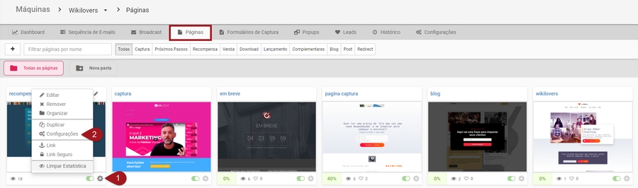 Nº1– Dentro da sua máquina, na aba “Páginas”, localize a página que deseja habilitar o consentimento e clique no ícone de engrenagem.
