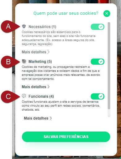 Nº11– Em “Minhas Opções”, o lead terá acesso para configurar quem pode usar seus cookies. Abaixo explicamos melhor quais opções o visitante terá.