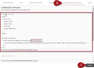 6 – Clique em Configurações Avançadas. Em Scripts do Cabeçalho (HEAD), insira o seguinte código: