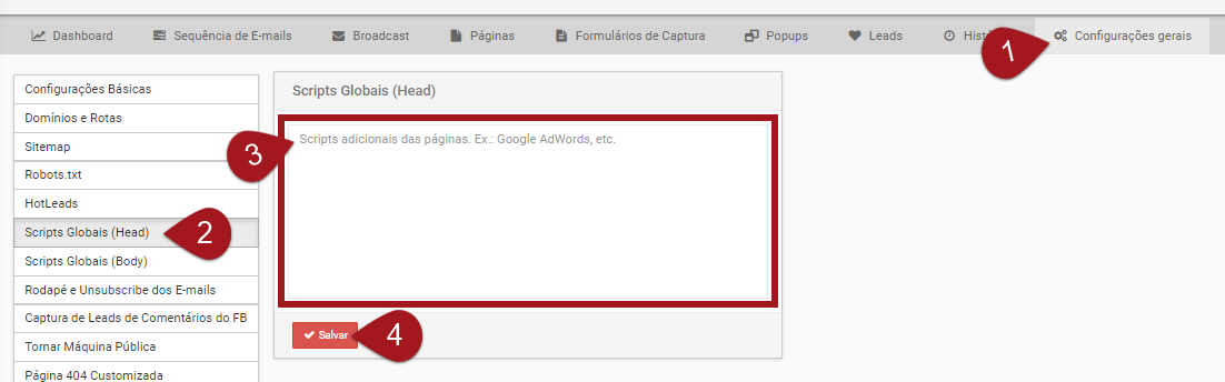 No menu lateral acesse Scripts Globais (Head); Obs: O processo é o mesmo para a opção Scripts Globais (Body)
