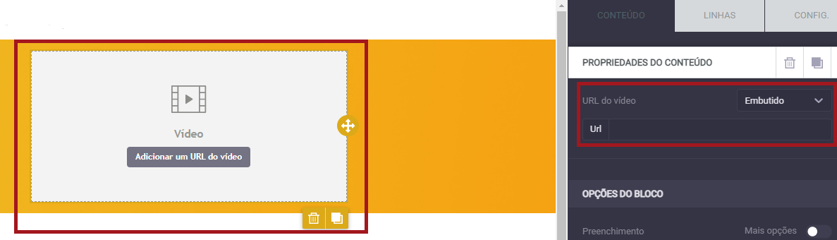 No Editor por Componentes, é possível inserir vídeos do Youtube ou do Vimeo arrastando um bloco de vídeo para a página e inserindo o link no campo “Url”. No entanto, se você fizer dessa forma com vídeos de outras plataformas, como o Dailymotion ou o Loom, por exemplo, eles não serão reconhecidos.