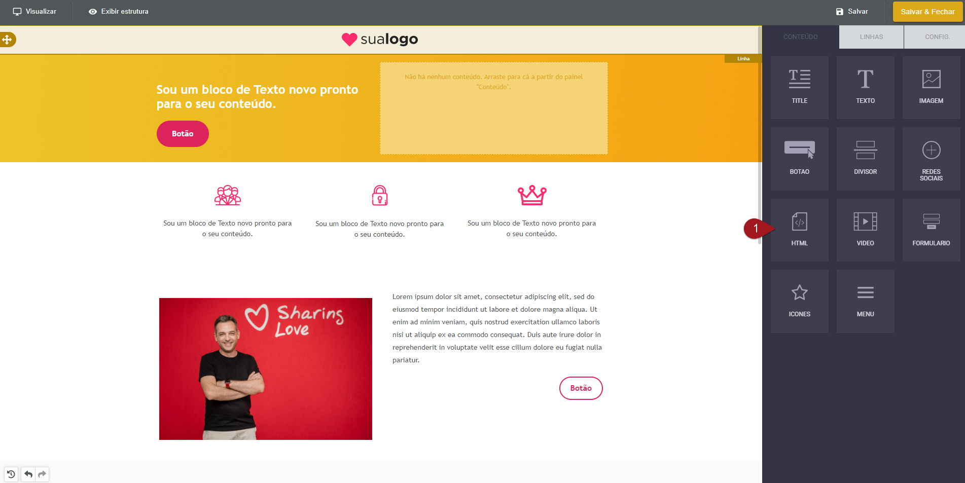 Nº1– No Construtor por Componentes, selecione “HTML” na aba “Conteúdos” e arraste para o posição que deseja que o vídeo fique em sua página.