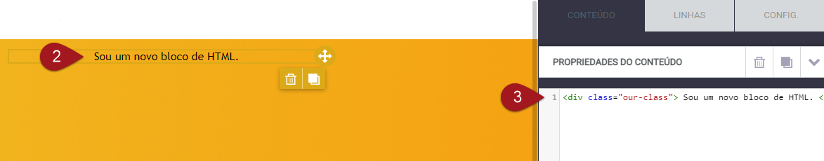 Nº3– Uma nova aba vai abrir com as propriedades do conteúdo do bloco e um código de HTML.