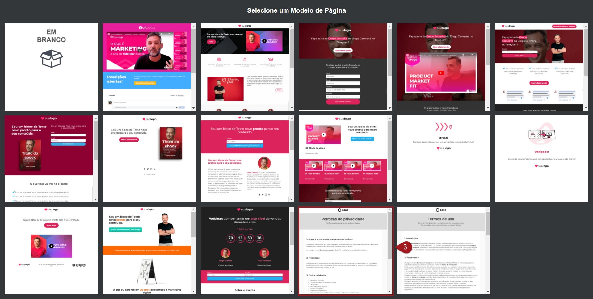 Nº3– Caso queira criar uma página de Políticas de Privacidade, clique no modelo correspondente.