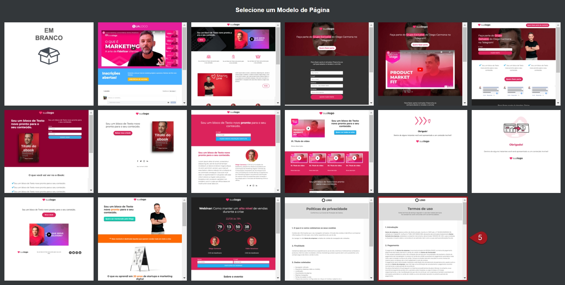 Nº5– Para criar uma página de Termos de Uso, selecione o modelo indicado.