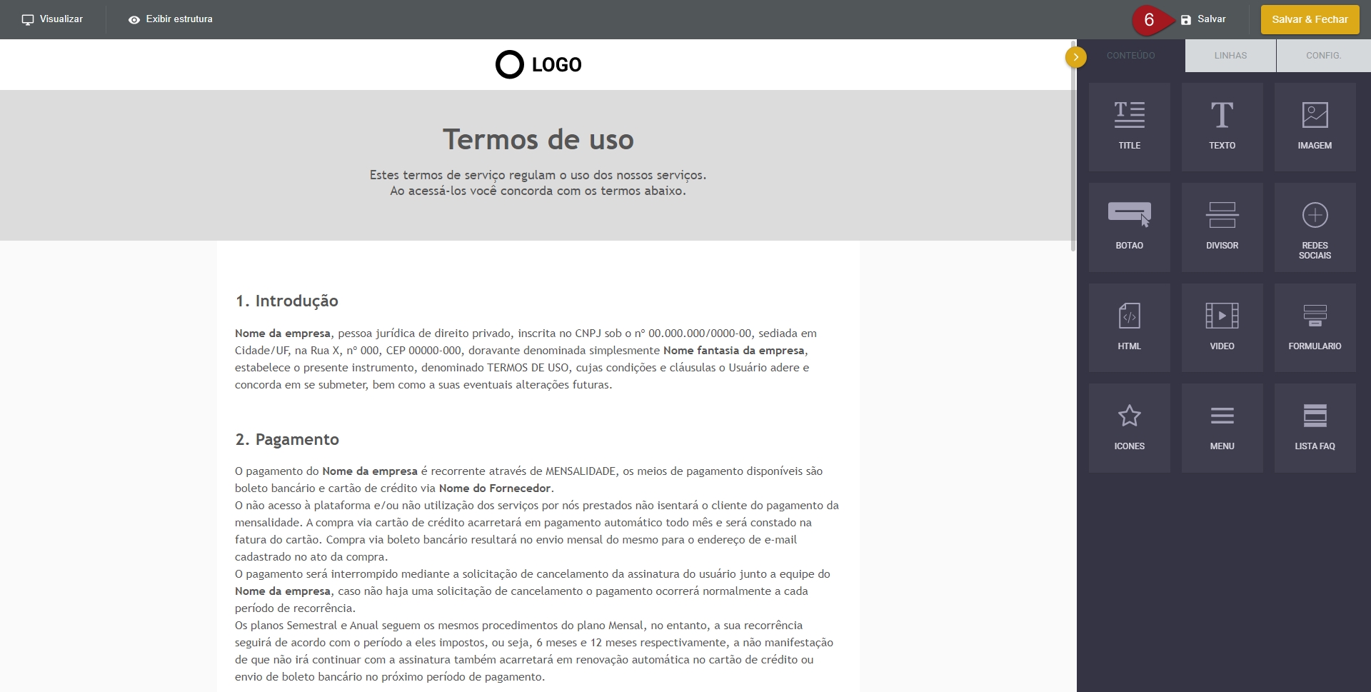 Nº4– Dentro do editor, leia todo o conteúdo da página atentamente e o altere de acordo com o que precisa para sua empresa. Certifique-se de substituir as imagens da logo também.