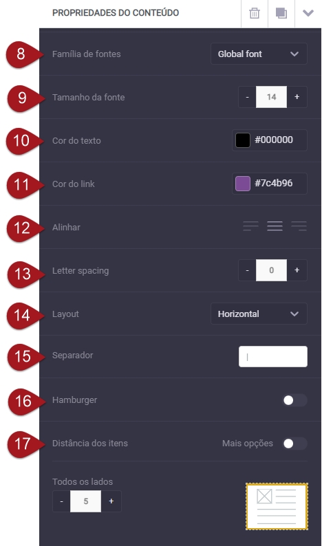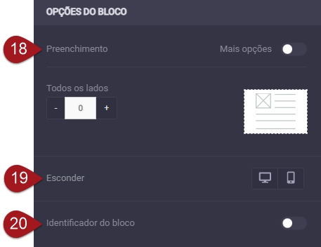 Nº18– Além das opções próprias do menu, há aquelas gerais do bloco. Em “Preenchimento”, é possível alterar os espaços ao redor do menu igualmente em todos os lados ou habilitar o campo “Mais opções” e alterar cada lado individualmente.