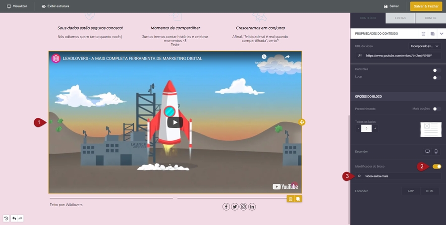 Nº3– Em “ID” substitua a informação que vem de amostra por um nome que o ajude a localizar este bloco mais tarde. Não pode haver acentos ou espaços, então no nosso exemplo colocamos: video-saiba-mais.