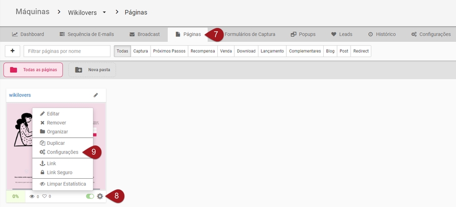 Nº7– Vá até a aba “Páginas” da sua máquina.