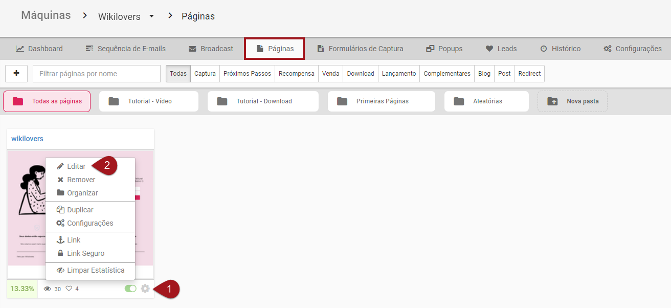 Nº1– Dentro da aba “Páginas” de sua máquina, clique no ícone de engrenagem daquela que deseja inserir o contador.
