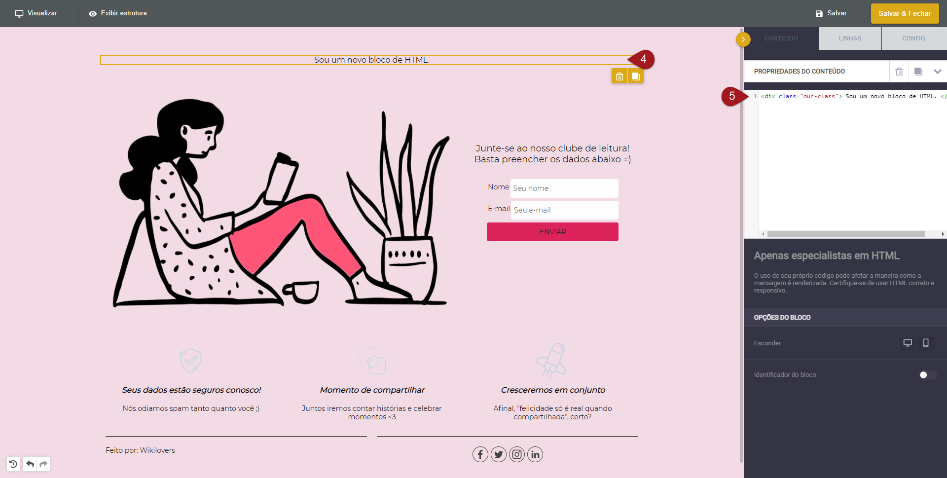 Nº4– Clique sobre “Sou um novo bloco de HTML”.