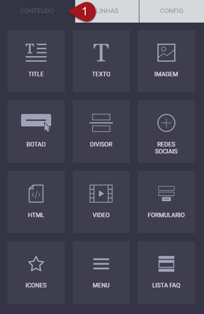Nº1– Na primeira aba do menu que fica na lateral direita tem todos os componentes que podem ser adicionados na estrutura da página, como por exemplo “Texto” e “Imagem”. Basta segurar aquele que deseja e arrastar até o local da página que pretende inserir.