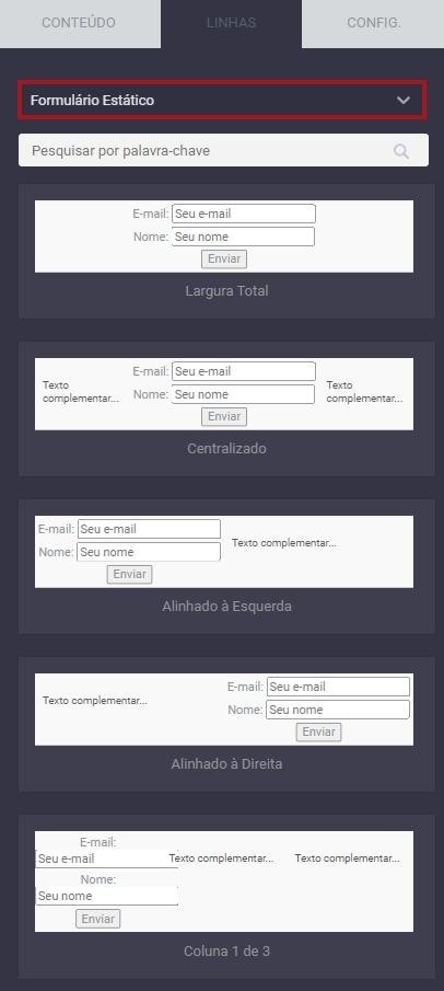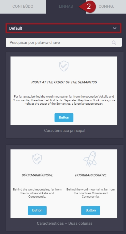 Se deixar a visualização como “Default”, aparecerão exemplos de linhas com conteúdos prévios. Basta procurar a que melhor se encaixa para o que deseja fazer, arrastar e soltar na sua página onde pretende adicionar.