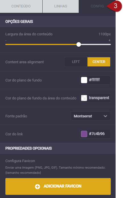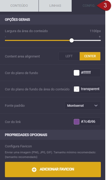 Nº3– Em “Configurações” há as opções gerais da página como um todo. Aqui é possível alterar, por exemplo, a “Largura da área do conteúdo” e a “Cor do plano de fundo” de toda a página.