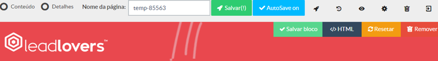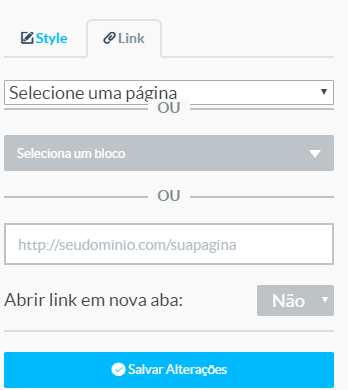 – Clicando em Detalhes < no botão Além de modificar cores, texto, font, você terá uma aba chamada “link” aonde é possível linkar com outro bloco ou incluir um link para download.