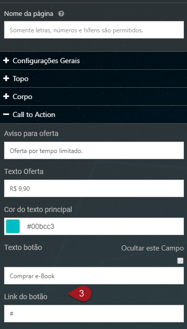 Nº 3 Nesse modelo em especifico na opção “Call to Action” é o local para ajustar o botão de download. Conforme print acima nesse local é possivel editar o texto da oferta, cor do botão e o link do botão.