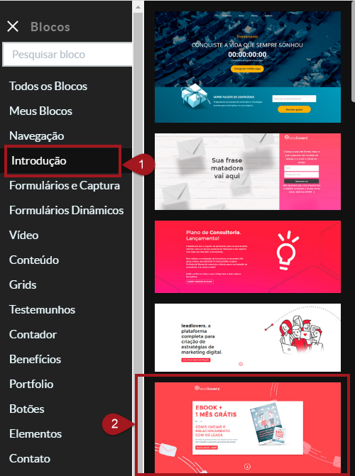Nº 1 Entrei na categoria Introdução Nº 2 Utilizei o bloco Ebook, conforme print acima.