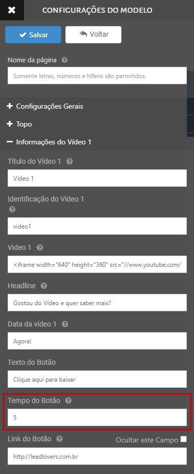 Para animar um elemento no Editor de Modelos Prontos, se certifique que o modelo escolhido já tenha essa configuração, em alguns ela está pré-configurada em botões. Por exemplo, na imagem abaixo, na opção “Tempo do Botão” é possível definir quantos segundos o mesmo levará para aparecer na página.