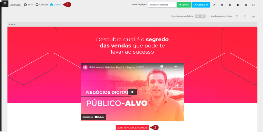 As páginas construídas por esse editor já vem com os elementos e configurações pré-determinados, com a maioria deles sendo estáticos e não permitindo alterações. Caso prefira maior liberdade na construção de sua página, recomendamos que dê uma olhada nas animações que podem ser feitas pelo Construtor por Blocos.