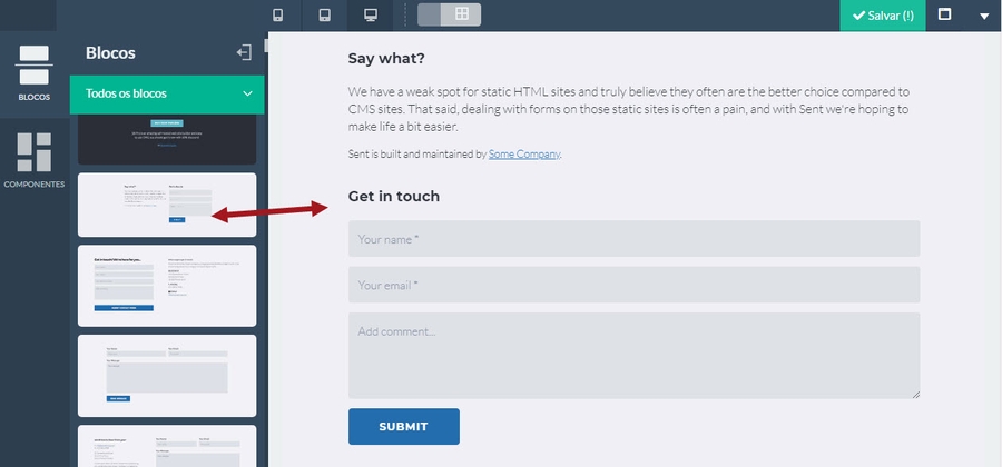 Nº 1 – Escolha o bloco desejado e arraste na página. Nesse exemplo utilizei um bloco que já possui um formulário. Vamos substitui-lo pelo que criamos na máquina daqui a pouco.