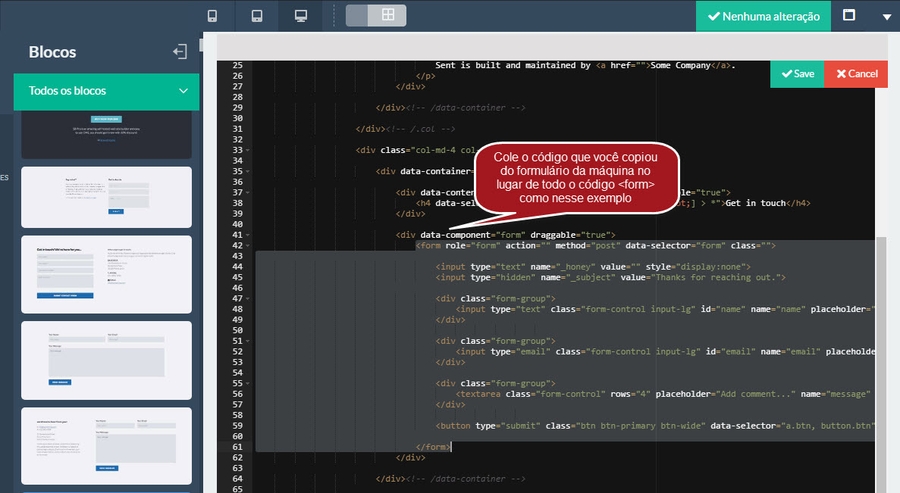 Nº 4 – Abrirá um código parecido com o do exemplo abaixo. Encontre a parte que começa com “<form” e termina no “</form>” e cole o código do formulário que você criou na máquina no lugar desse que está no bloco