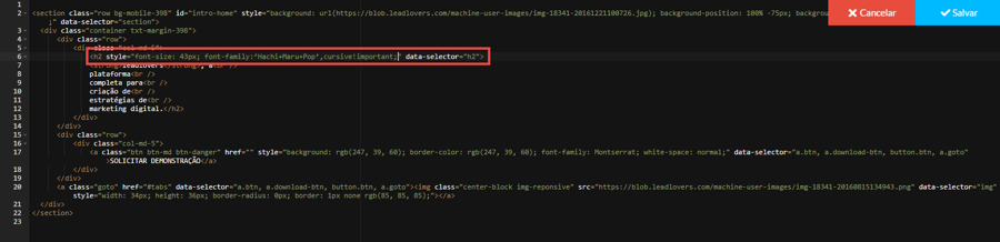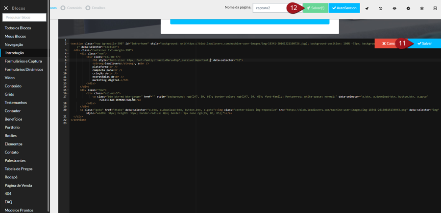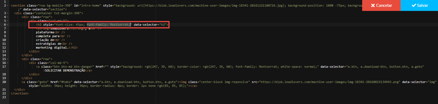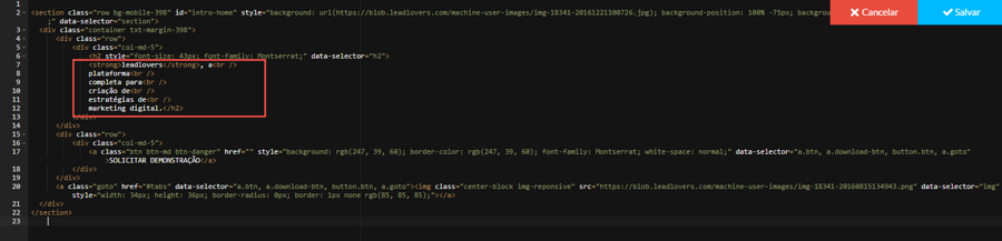 Feito isso abrirá a edição de HTML do bloco. Agora você irá encontrar o texto que deseja alterar nesse bloco dentro do código HTML. Nesse exemplo iremos alterar o texto “leadlovers, a plataforma completa para criação de estratégias de marketing digital.”.
