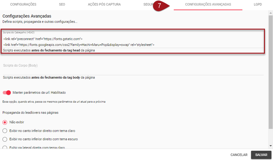 Nº8– E em Scripts do Cabeçalho (HEAD), cole o script da fonte escolhida que copiou no site do Google Fonts (passo 04 deste tutorial) e clique em Salvar.