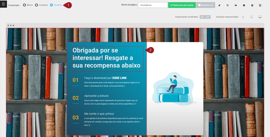 Nº1– Na barra que fica na parte de cima do Construtor por Blocos há três opções: “Blocos”, “Conteúdo” e “Detalhes”. Selecione “Detalhes”.