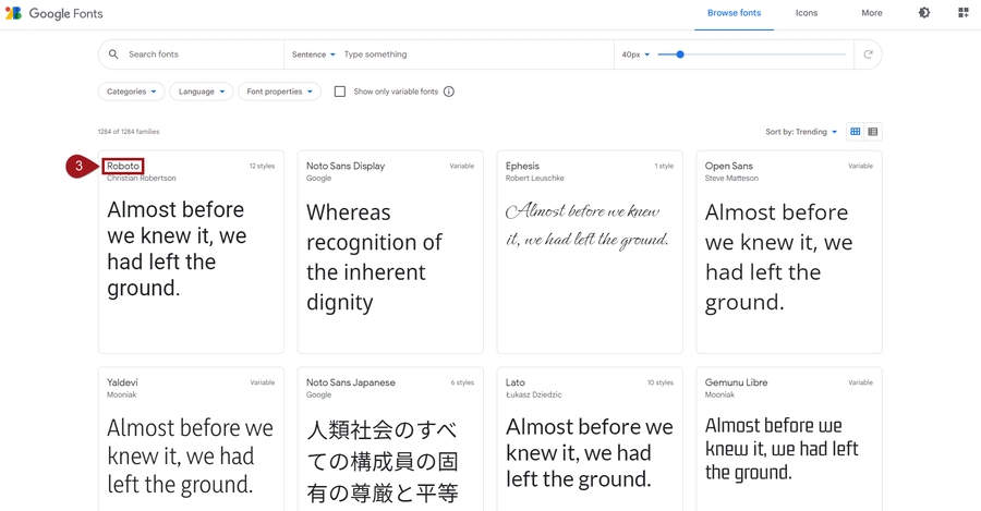 Nº2– Escolha a que preferir para a sua página. No nosso exemplo, escolhemos a “Roboto” para demonstrar.