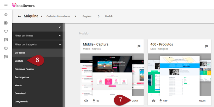 Nº 6 Selecione a opção Captura para filtrar pelos modelos prontos de página de captura