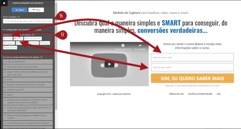 Nº 9 No menu Configurações do Formulário de Captura selecione as informações que deseja capturar dentre as opções possíveis.