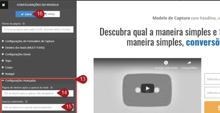 Nº 13 Aqui no menu Configurações Avançadas é aonde você consegue realizar as configurações de redirect, ou seja, o que irá abrir para o lead após ele se capturar na página ou para já capturados que tentam se cadastrar novamente. Obs: Neste artigo iremos falar apenas das duas primeiras opções deste menu