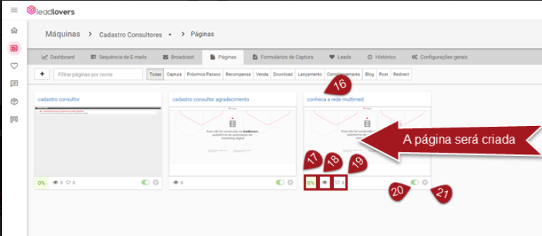 Pronto, agora a página estará criada em sua máquina em Páginas (Nº 3) no menu superiorNº 17 Nome dado à página Nº 18 Porcentagem de conversão (captura) da página, medida em cima dos dados de quantas visualizações a página teve e quantas conversões ela gerou