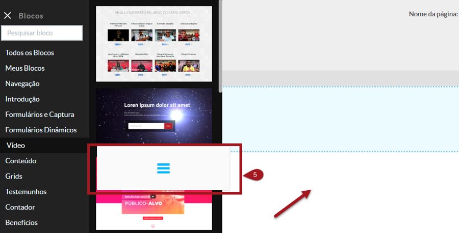 No construtor os blocos são separados por categorias. Clicando na categoria Vídeos , terá várias opções e você poderá escolher o modelo que melhor se encaixa em sua página, são os bloco pré criados e podem ser modificados pelo menu ou por html.