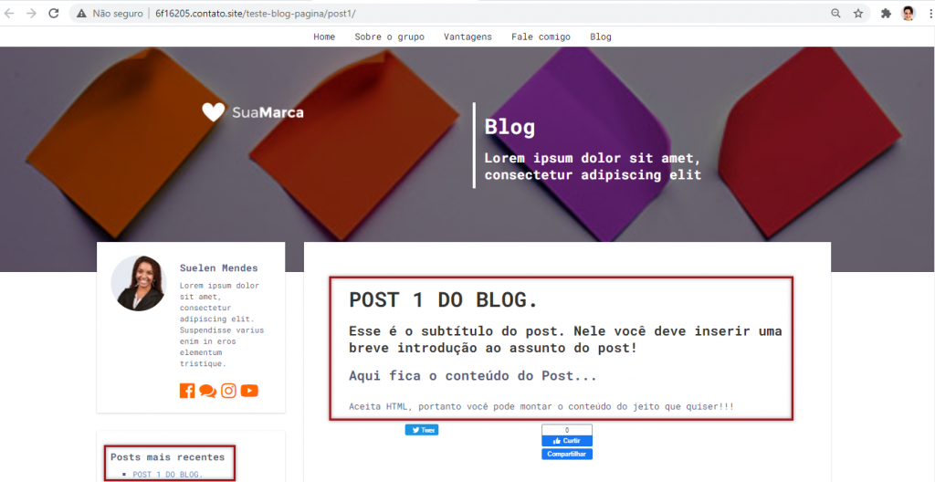 Sendo assim, essa página do tipo post, ficará automaticamente vinculada a página central/raiz do blog.