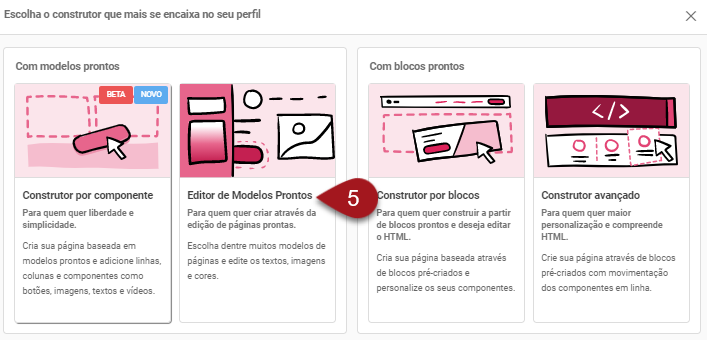Após clicar em criar nova página, uma janela com as opções de construtores de página se abrirá.
