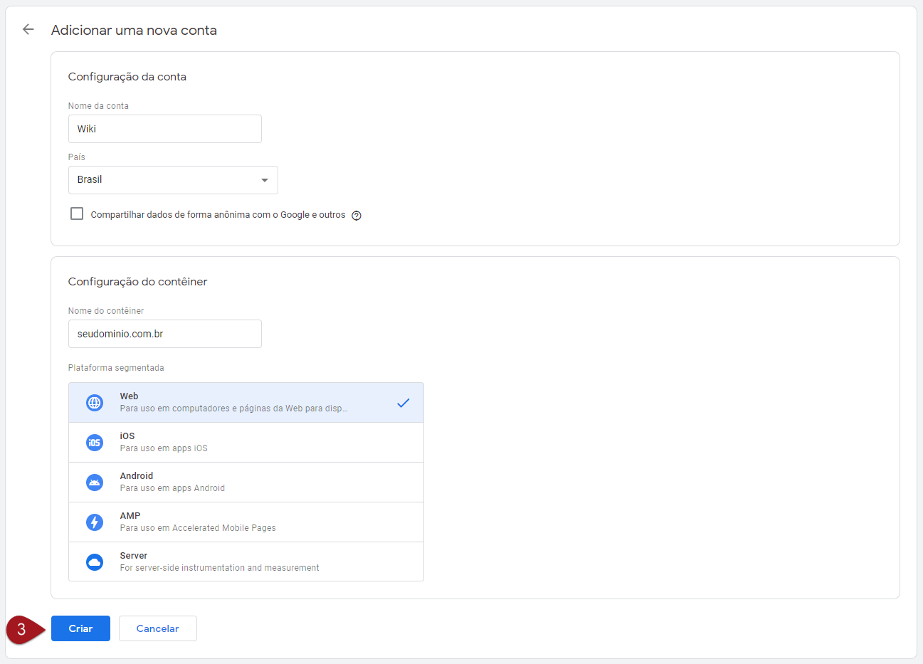 Clique em Criar Conta, preencha as informações solicitadas e selecione Web como plataforma de destino/ segmentada.
